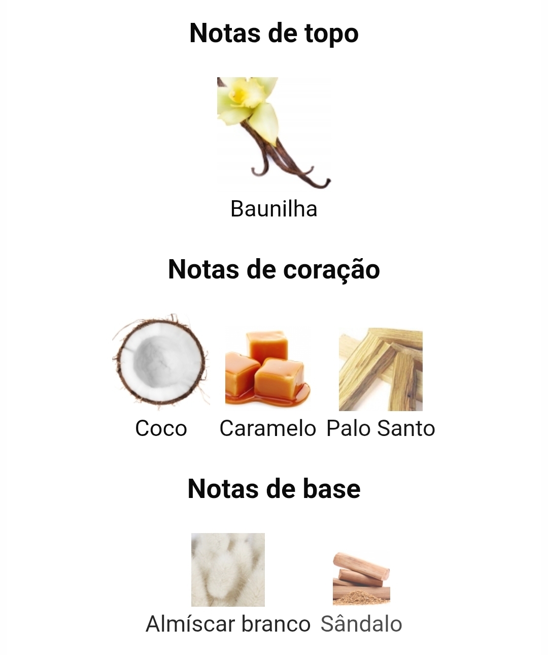 A nota de topo é baunilha; as notas de coração são coco, caramelo e palo santo; as notas de fundo são almíscar branco e sândalo.