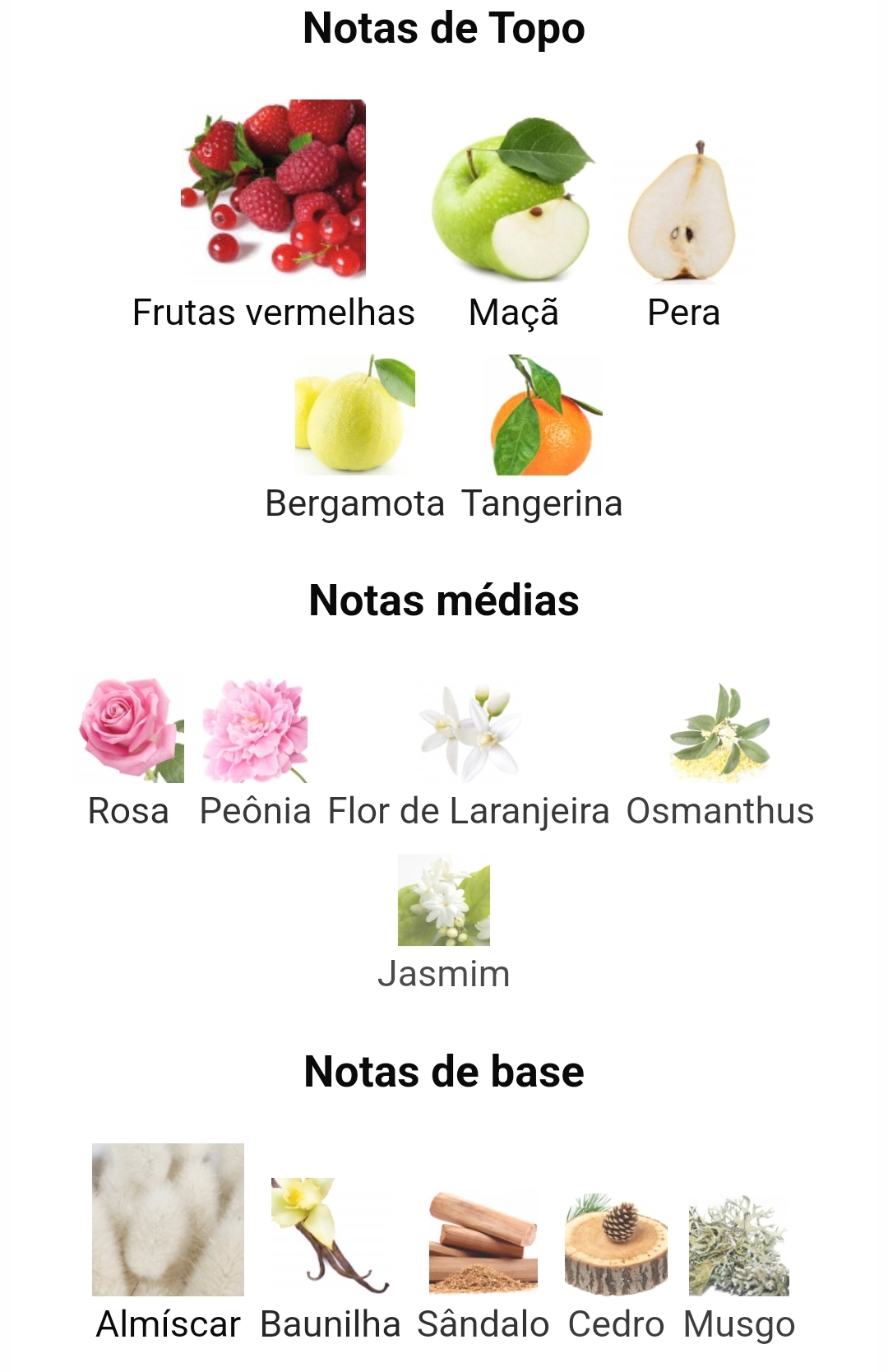 As notas de topo são Frutas Vermelhas, Maçã, Pêra, Bergamota e Tangerina; as notas de coração são Rosa, Peônia, Flor de Laranjeira, Osmanthus e Jasmim; as notas de base são Almíscar, Baunilha, Sândalo, Cedro e Musgo.