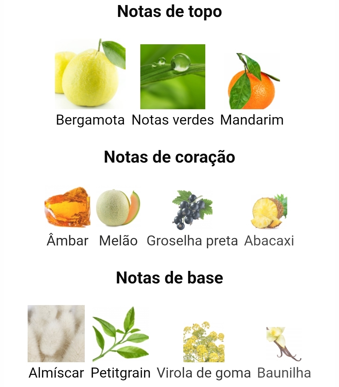 As notas de topo são bergamota, notas verdes e tangerina; as notas de coração são âmbar, melão, groselha preta e abacaxi; as notas de fundo são almíscar, petitgrain, gálbano e baunilha.