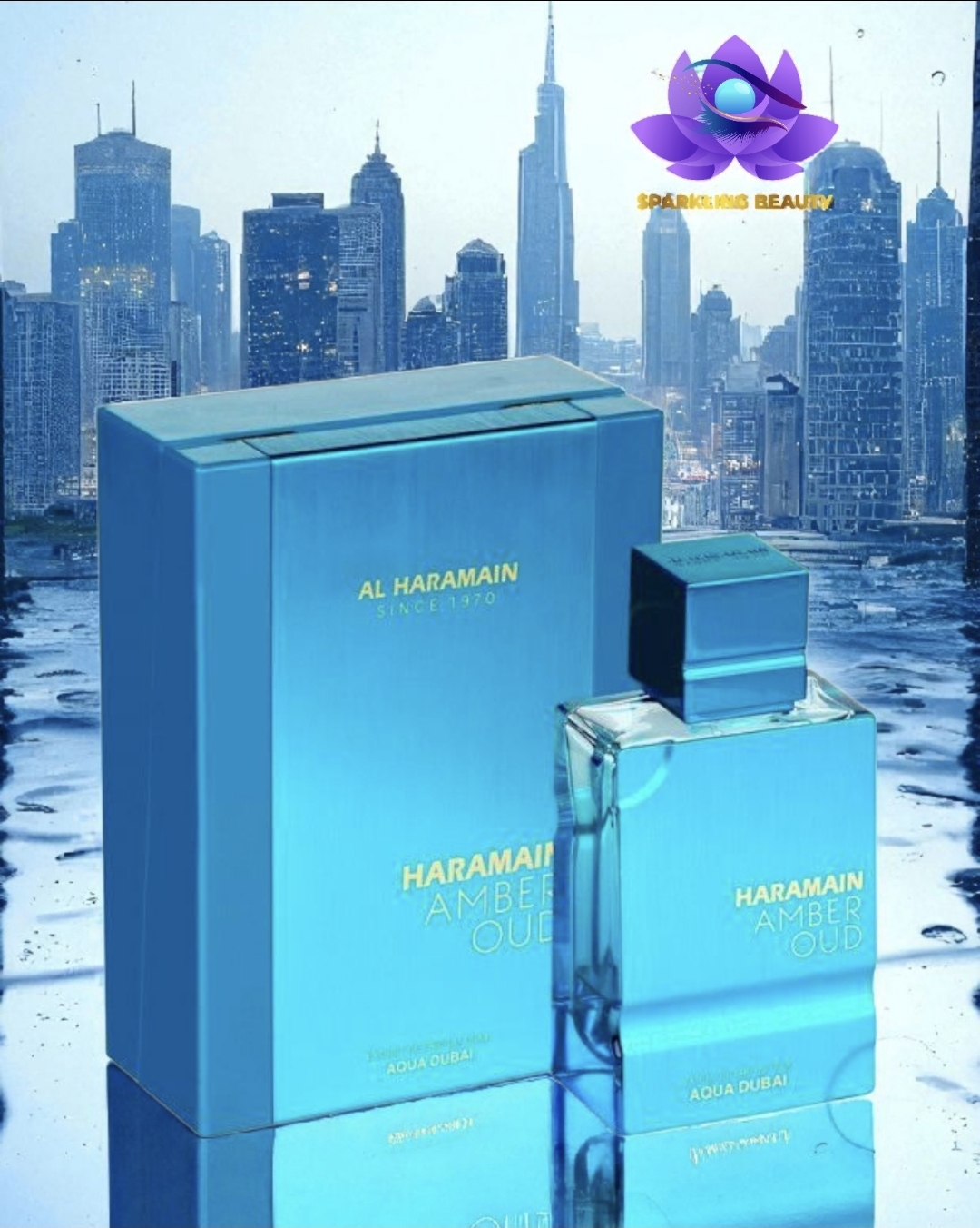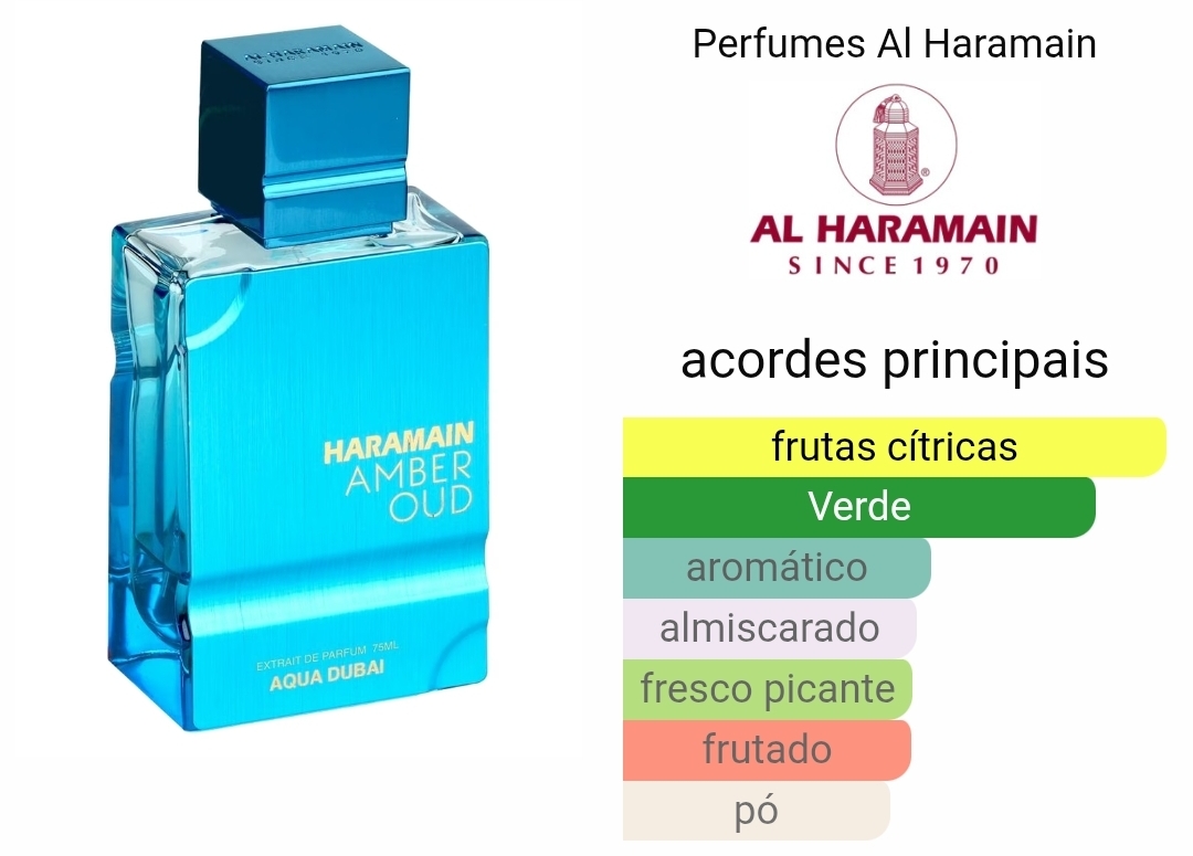 Amber Oud Aqua Dubai, da Al Haramain Perfumes, é uma fragrância aromática frutada para homens e mulheres.