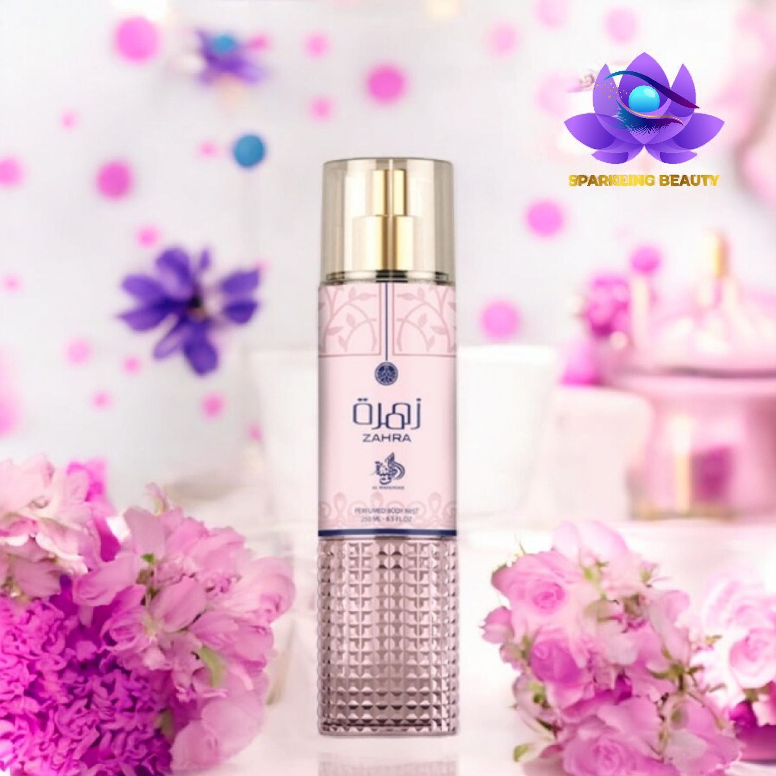 Body Mist Zahra da Al Wataniah, em frasco de 250 ml, é uma fragrância floral delicada que se inicia com notas frescas de flor de laranjeira e flores brancas leves. Evolui para um buquê cremoso de jasmim e tuberosa, assentando sobre uma base suave de almíscar, baunilha e madeira de cedro, para uma sensação aveludada