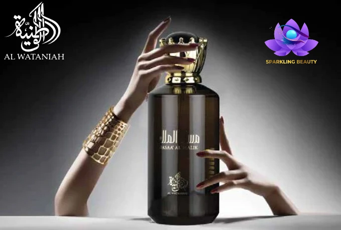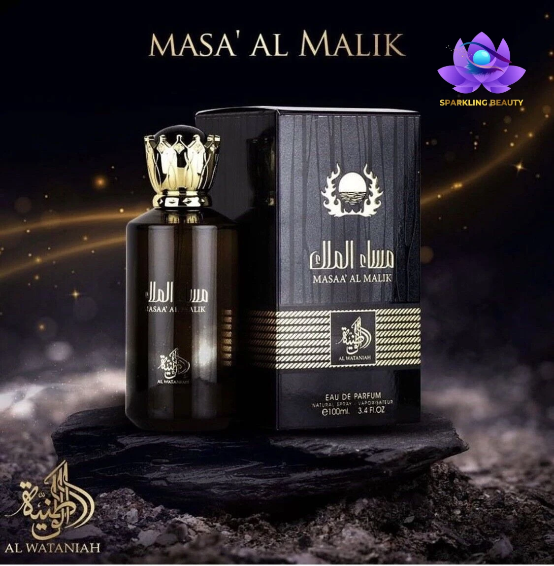 Frasco de perfume preto com tampa dourada e caixa preta com texto MASA' AL MALIK
