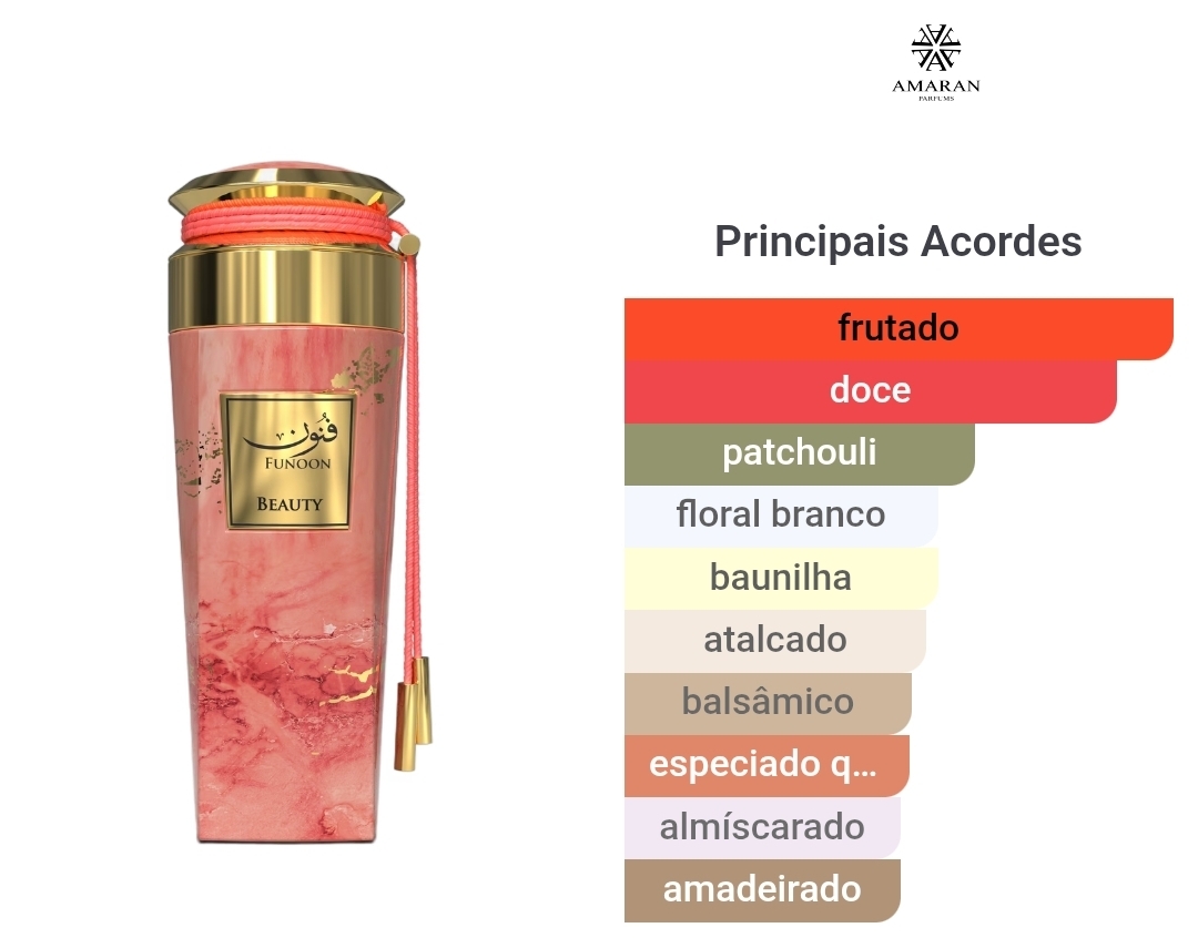 O Funoon Beauty Amaran é um perfume árabe feminino moderno e envolvente, perfeito para quem gosta de fragrâncias doces, frutadas e irresistíveis.