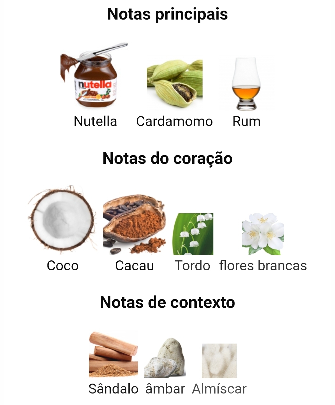 As notas de topo são Nutella, Cardamomo e Rum; as notas de coração são Coco, Cacau, Lírio-do-vale e Flores Brancas; e as notas de fundo são Sândalo, Âmbar e Almíscar.