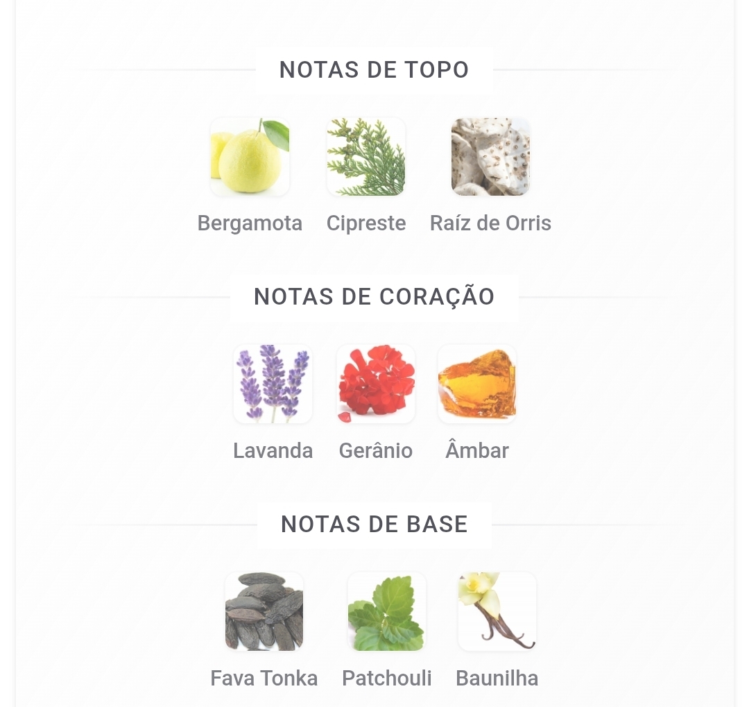 As notas de topo são: Bergamota, Cipreste e Raíz de Orris. As notas de coração são: Lavanda, Gerânio e Âmbar. As notas de fundo são: Fava Tonka, Patchouli e Baunilha.