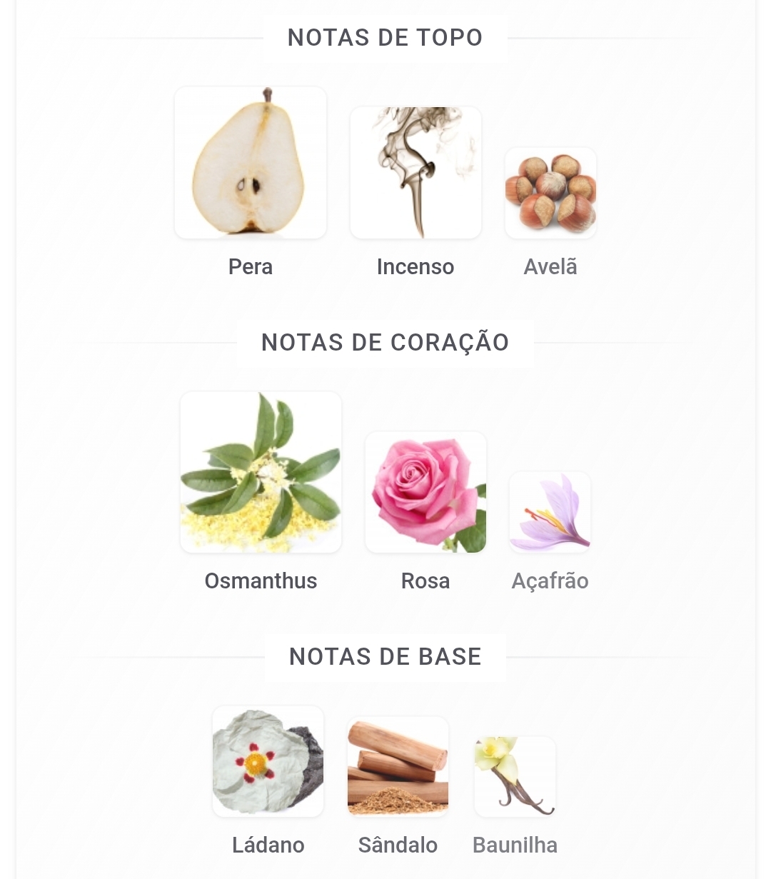 As notas de topo são: Pera, Incenso e Avelã. As notas de coração são: Osmanthus, Rosa e Açafrão. As notas de fundo são: Ládano, Sândalo e Baunilha.