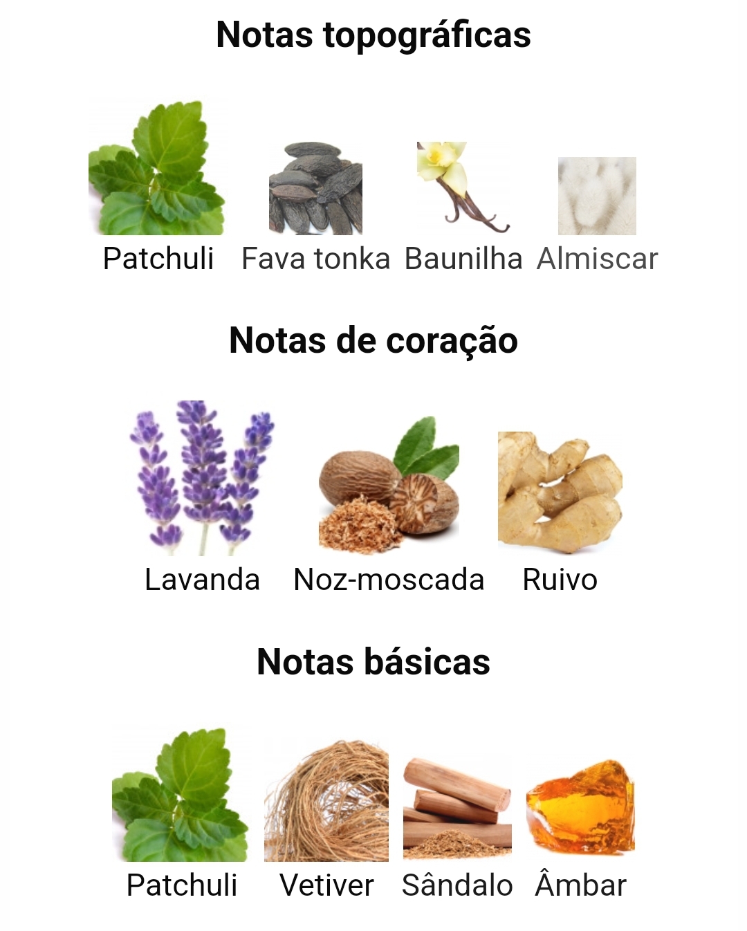 As notas de topo são Patchouli ou Oriza, Fava Tonka, Baunilha e Almíscar; notas de coração são lavanda, madressilva e gengibre; As notas de base são Patchouli ou Oriza, Vetiver, Sândalo e Âmbar