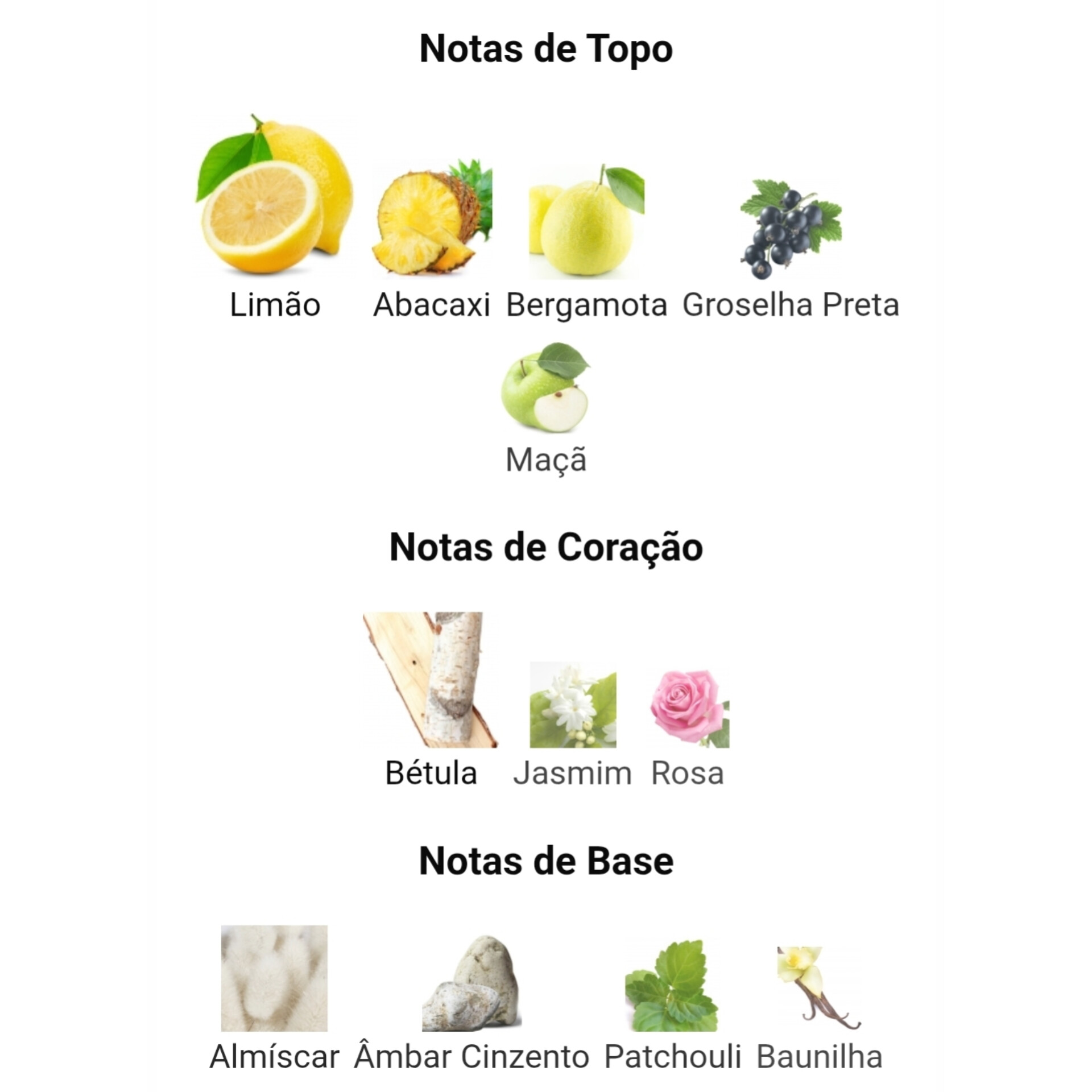 Notas de Cabeça : ananás, groselheira negra, maçã, bergamota, limão