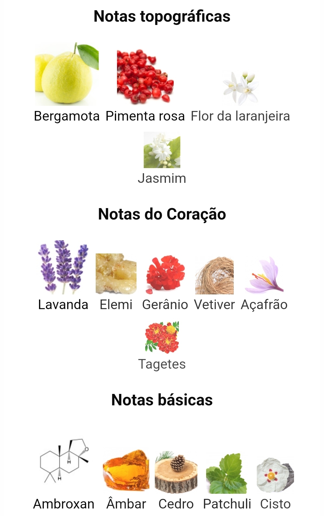As notas de topo incluem bergamota, pimenta rosa, flor de laranjeira e jasmim; notas de coração de lavanda, elemi, gerânio, vetiver, açaí e calêndulas; As notas de base são Ambroxan, Âmbar, Cedro, Patchouli ou Oriza e Cistus.