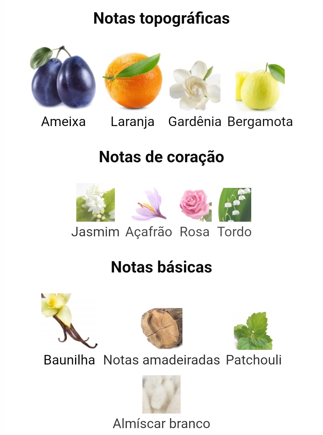 notas de saída temos ameixa, laranja, gardênia e bergamota; como notas de coração estão jasmim, açafrão, rosa e lírio-do-vale; como notas de fundo são baunilha, notas amadeiradas, patchouli e almíscar branco.