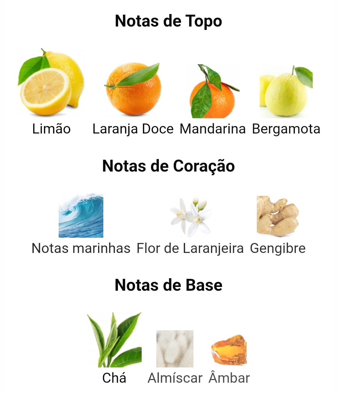 As notas de topo são: Limão, Laranja Doce, Mandarina e Bergamota.