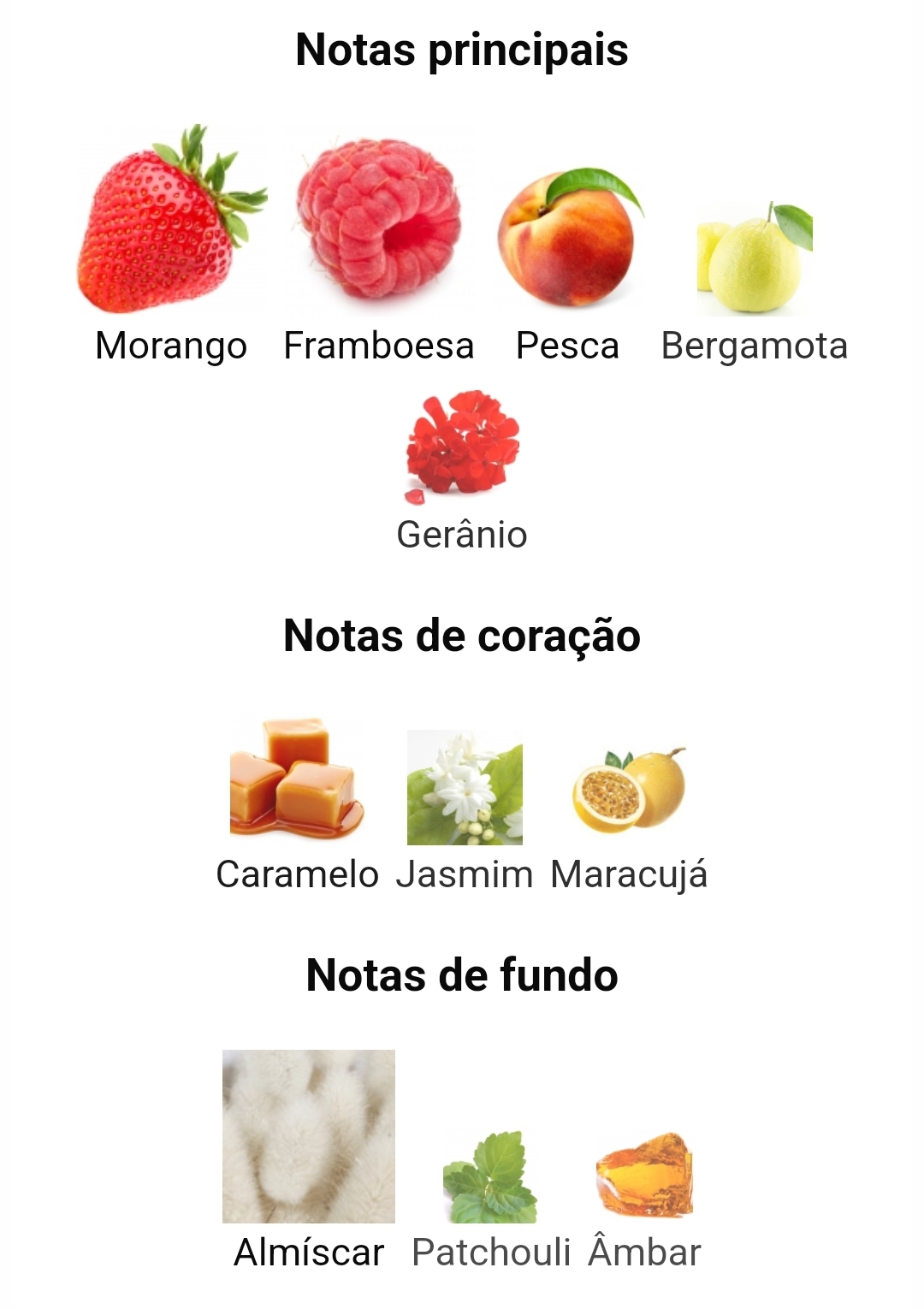 As notas de topo são morango, framboesa, pêssego, bergamota e gerânio; as notas de coração são caramelo, jasmim e maracujá; As notas de fundo são Almíscar, Patchouli ou Oriza e Âmbar.