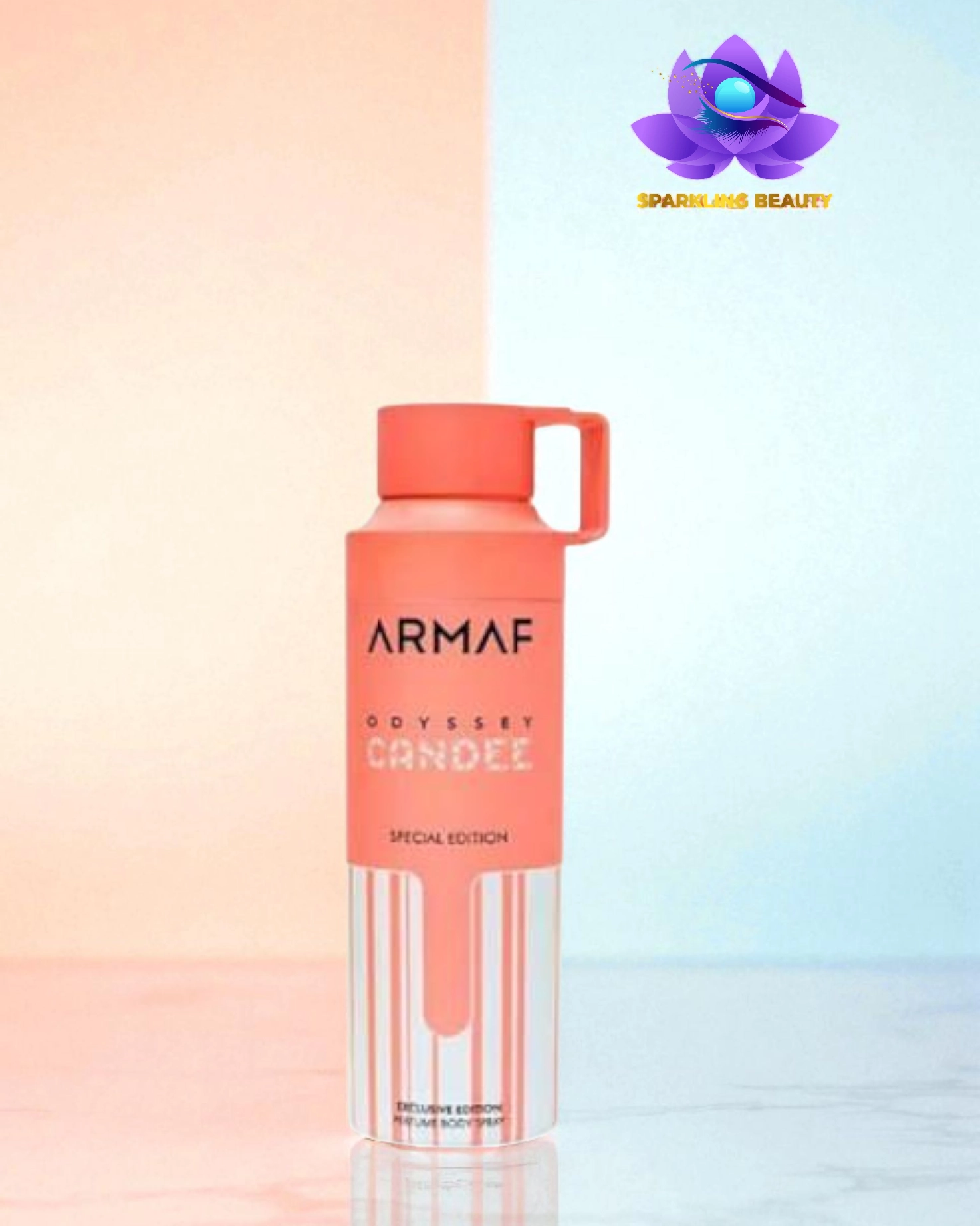 Frasco de perfume Armaf Odyssey Candee edição especial cor coral e creme com riscas verticais