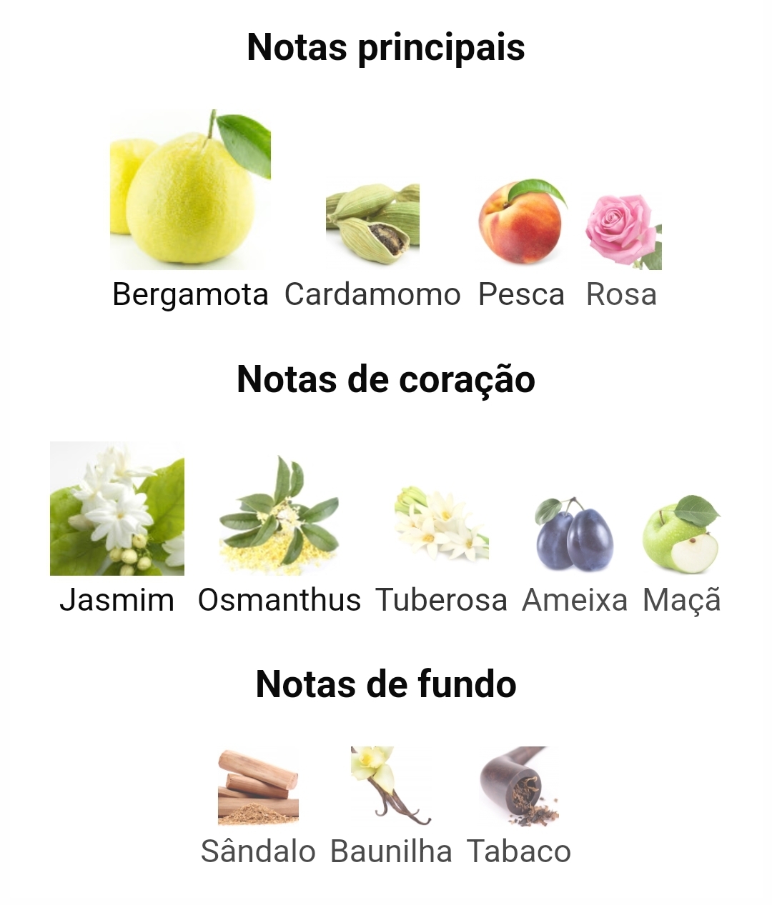 . As notas de topo são Bergamota, Cardamomo, Pêssego e Rosa; as notas de coração são Jasmim, Osmanthus, Tuberosa, Ameixa e Maçã; As notas de fundo são sândalo, baunilha e tabaco.