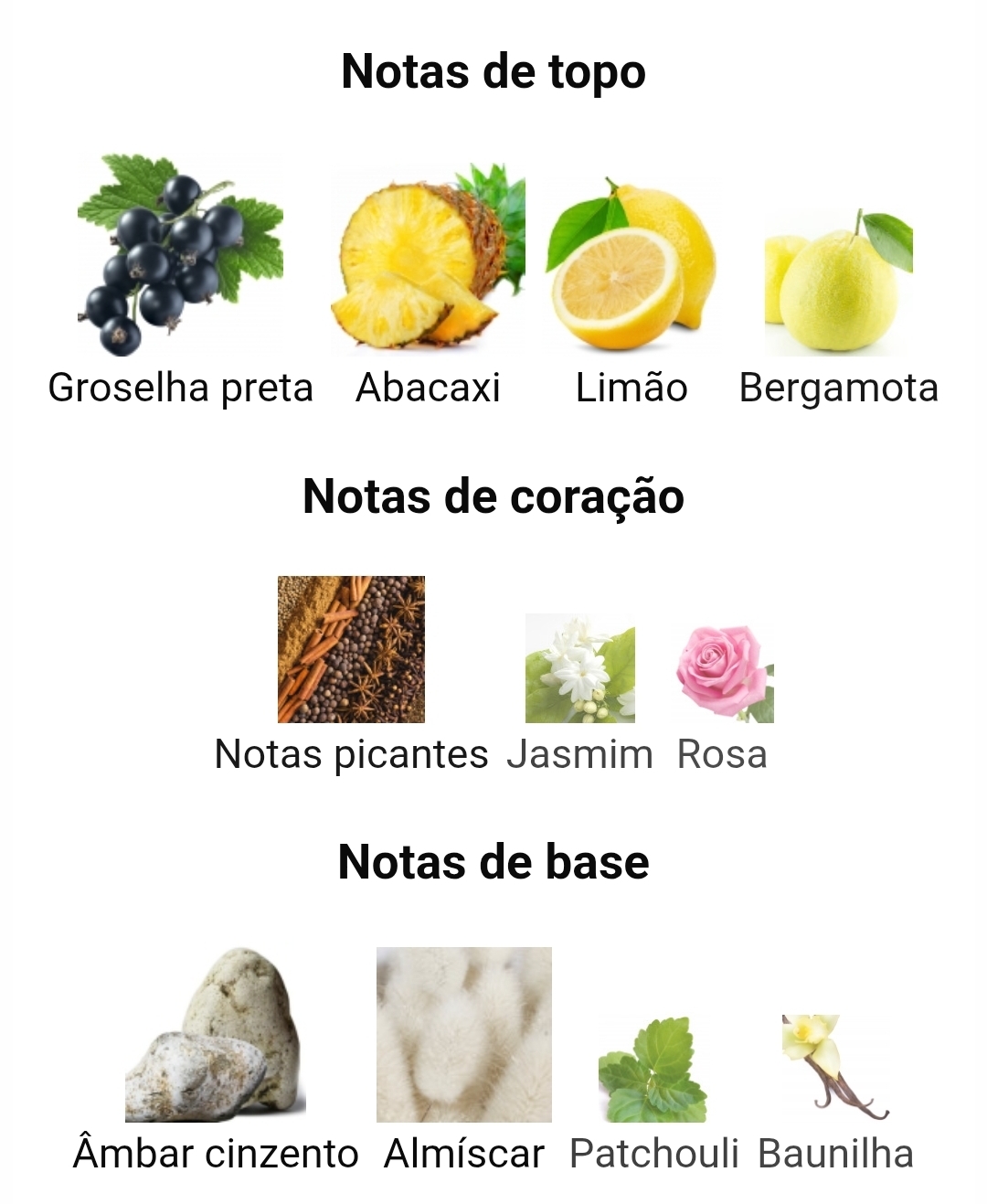 As notas de topo são groselha preta, abacaxi, limão e bergamota; as notas de coração são notas especiadas, jasmim e rosa; as notas de fundo são âmbar cinza, almíscar, patchouli e baunilha.