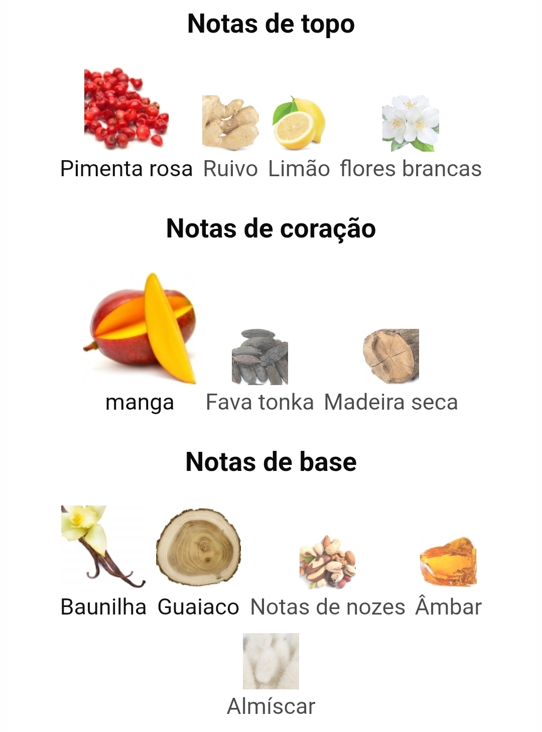 As notas de topo são pimenta rosa, gengibre, limão e flores brancas; as notas de coração são manga, fava tonka e madeira seca; as notas de fundo são baunilha, madeira guaiac, notas de noz, âmbar e almíscar.
