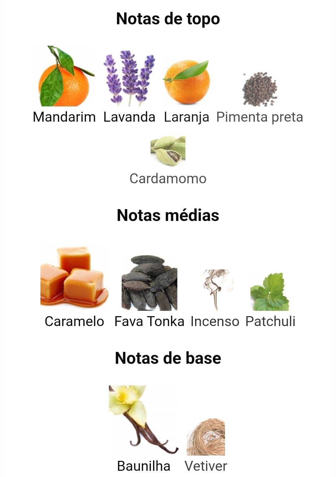 As notas de topo são tangerina, lavanda, laranja, pimenta-do-reino e cardamomo; as notas de coração são caramelo, fava tonka, incenso e patchouli; as notas de fundo são baunilha e vetiver.