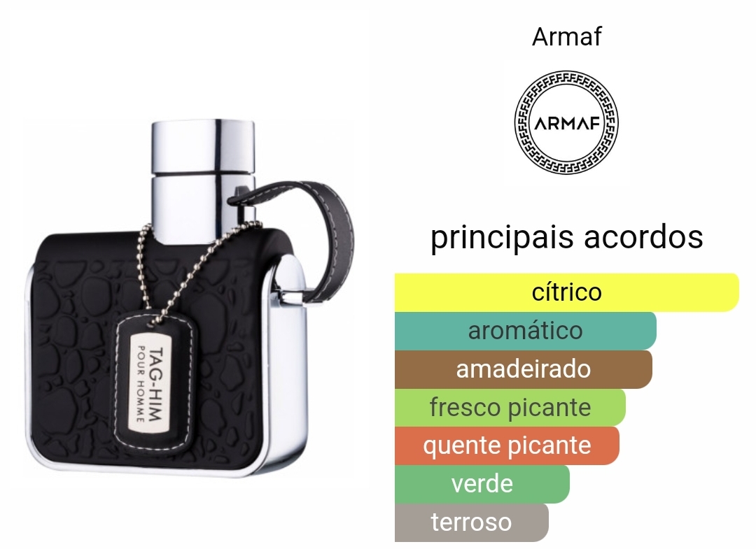 Tag-Him de Armaf é uma fragrância Amadeirada Especiada para homens. As notas de topo são Toranja, Limão, Pimenta Rosa e Bergamota; as notas de coração são Gengibre, Hortelã, Lavanda e Noz-moscada; as notas de base são Vetiver, Sândalo, Patchouli e Cedro.