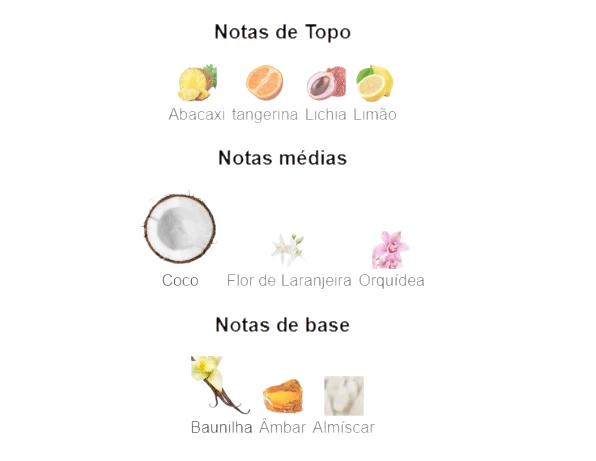 Notas de coração: Coco, Flor de Laranjeira e Orquídea;