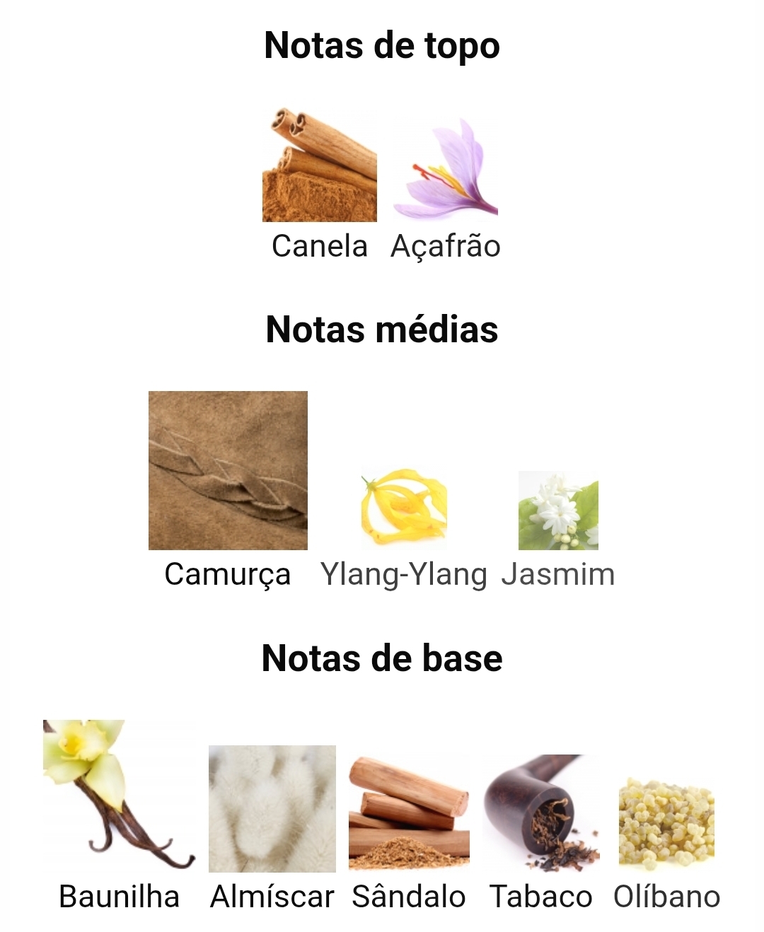As notas de topo são Canela e Açafrão; as notas de coração são Camurça, Ylang-Ylang e Jasmim; as notas de fundo são Baunilha, Almíscar, Sândalo, Tabaco e Olíbano