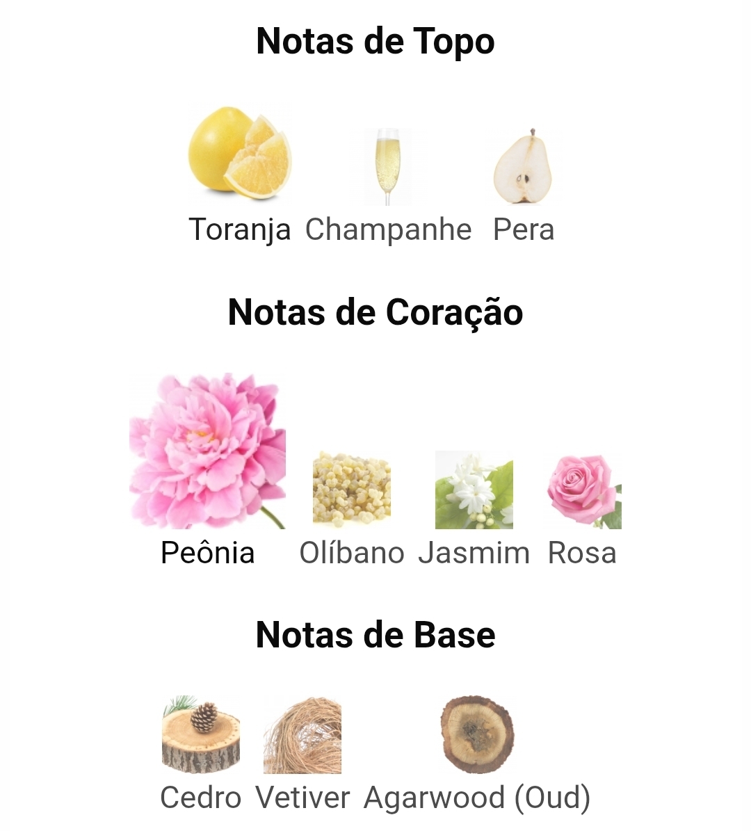 As notas de topo são: Toranja, Champanhe e Pera. As notas de coração são: Peônia, Olíbano, Jasmim e Rosa. As notas de fundo são: Cedro, Vetiver e Agarwood (Oud).