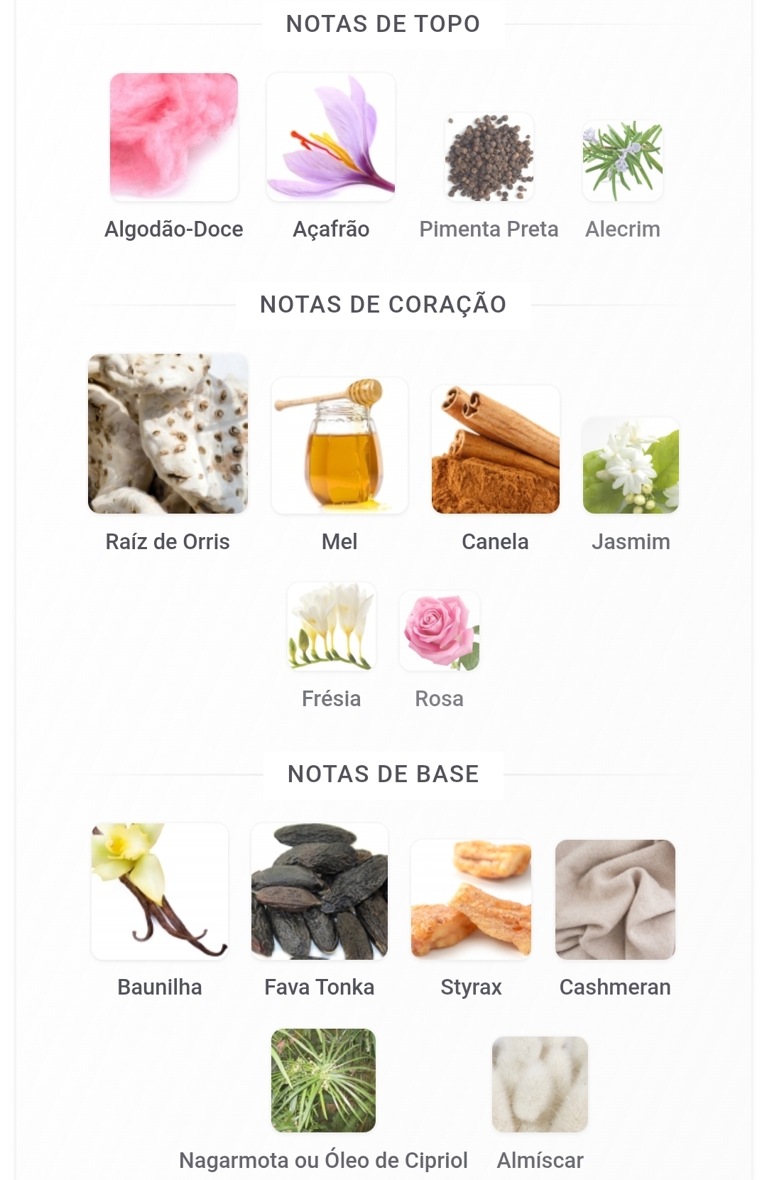 As notas de topo são: Algodão-Doce, Açafrão, Pimenta Preta e Alecrim. As notas de coração são: Raíz de Orris, Mel, Canela, Jasmim, Frésia e Rosa. As notas de fundo são: Baunilha, Fava Tonka, Styrax, Cashmeran, Nagarmota ou Óleo de Cipriol e Almíscar.