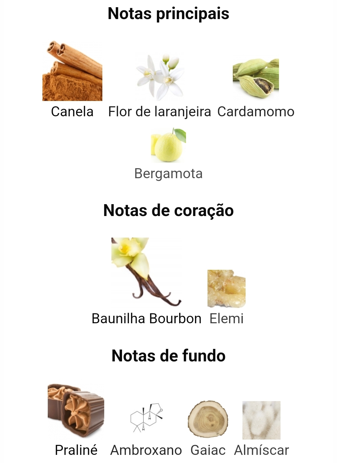 Notas de topo são canela, flor de laranjeira, cardamomo e bergamota; conforme indicado na receita, há um pouco de bourbon e elemi; conforme observado no fundo são praliné, ambroxan, guaiaco e almíscar
