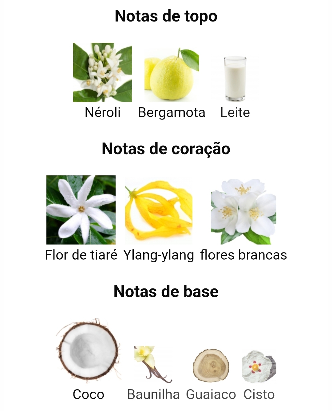 As notas de topo são neroli, bergamota e leite; as notas de coração são flor de tiaré, ylang-ylang e flores brancas; as notas de fundo são coco, baunilha, madeira guaiaco e ládano