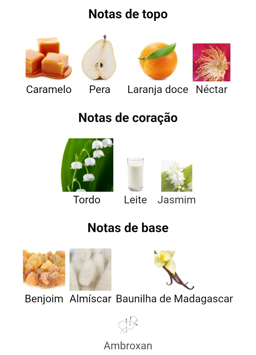 As notas de topo são caramelo, pera, laranja doce e néctar; as notas de coração são lírio-do-vale, leite e jasmim; as notas de fundo são benjoim, almíscar, baunilha de Madagascar e ambroxan.