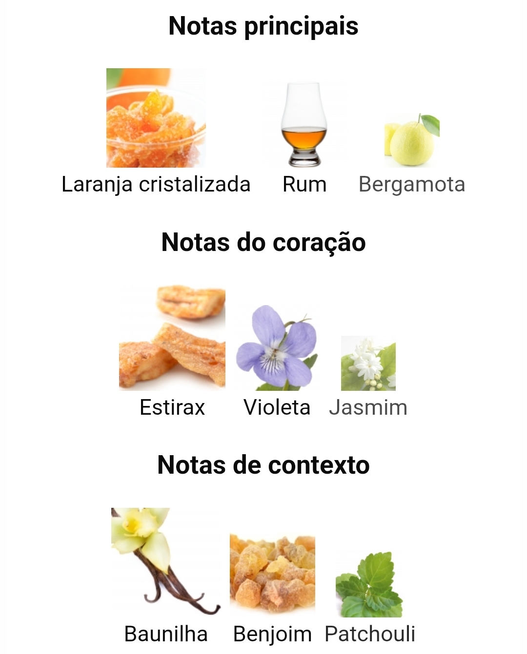 As notas de topo são laranja cristalizada, rum e bergamota; as notas de coração são estoraque, violeta e jasmim; as notas de fundo são baunilha, benjoim e patchouli