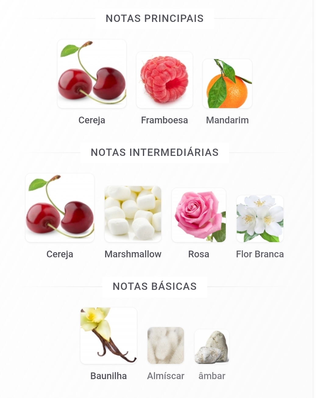 As notas de topo são cereja, framboesa e tangerina; as notas de coração são cereja, marshmallow, rosa e flor de laranjeira; e as notas de fundo são baunilha, almíscar e âmbar.