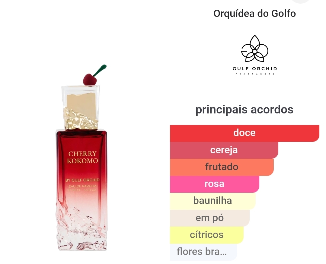 Cherry Kokomo, da Gulf Orchid , é uma fragrância floral frutada gourmand unisexo embora claramente mais apreciada pelo público feminino.