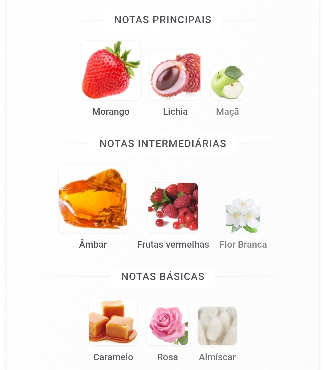 As notas de topo são morango, lichia e maçã; as notas de coração são âmbar, frutas vermelhas e flor de laranjeira; e as notas de fundo são caramelo, rosa e almíscar.