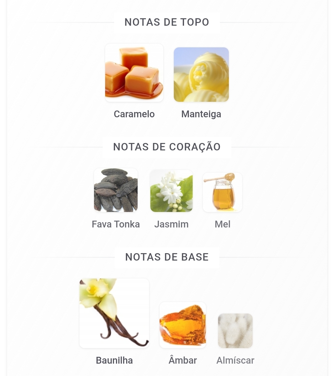 As notas de topo são: Caramelo e Manteiga. As notas de coração são: Fava Tonka, Jasmim e Mel. As notas de fundo são: Baunilha, Âmbar e Almíscar.