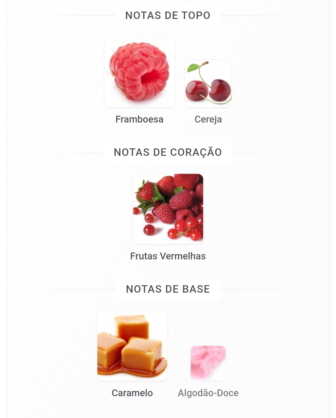 As notas de topo são: Framboesa e Cereja. A nota de coração é: Frutas Vermelhas. As notas de fundo são: Caramelo e Algodão-Doce.