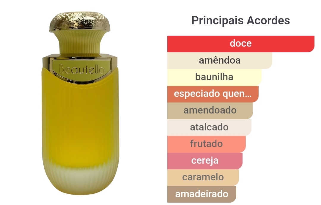As notas de topo são: Amêndoa e Cereja. As notas de coração são: Toffee e Açafrão. As notas de fundo são: Baunilha, Sândalo e Almíscar Branco.