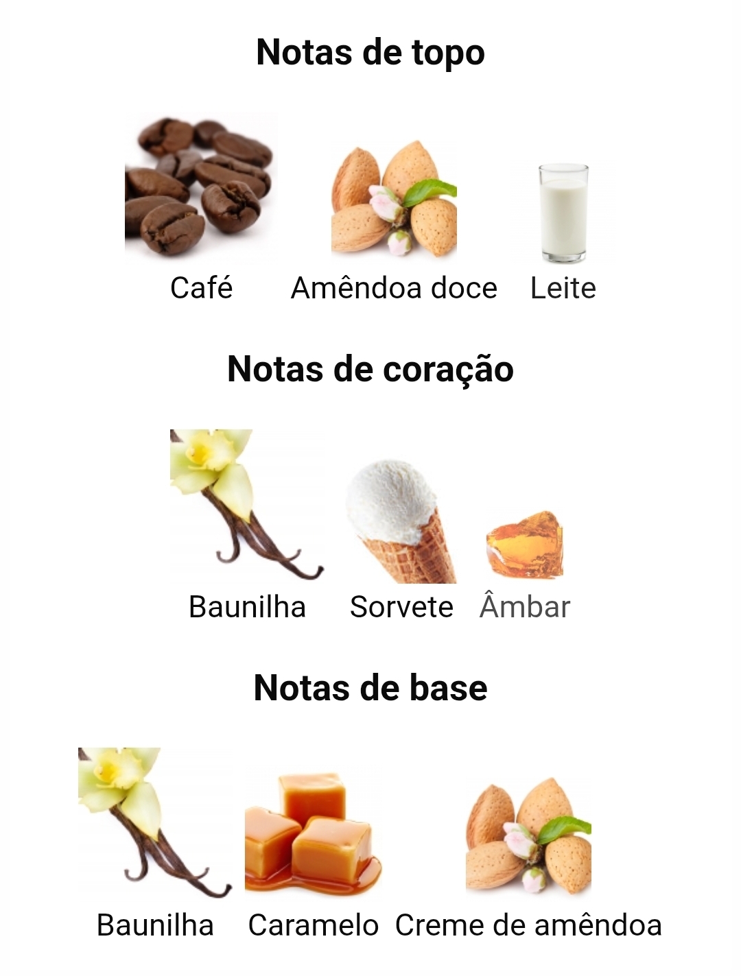 As notas de topo são café, amêndoa doce e leite; as notas de coração são baunilha, sorvete e âmbar; as notas de fundo são baunilha, caramelo e creme de amêndoa.