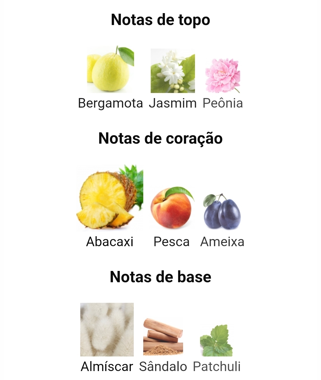 As notas de topo são bergamota, jasmim e peônia; as notas de coração são abacaxi, pêssego e ameixa; as notas de fundo são almíscar, sândalo e patchouli.