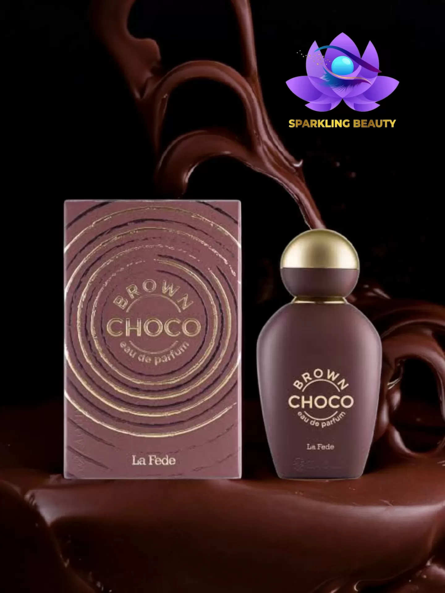 Frasco e caixa de perfume BROWN CHOCO com design castanho e dourado sobre chocolate derretido.