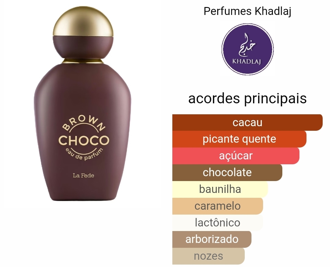 Frasco castanho de perfume Brown Choco com tampa dourada ao lado de gráfico de acordes principais