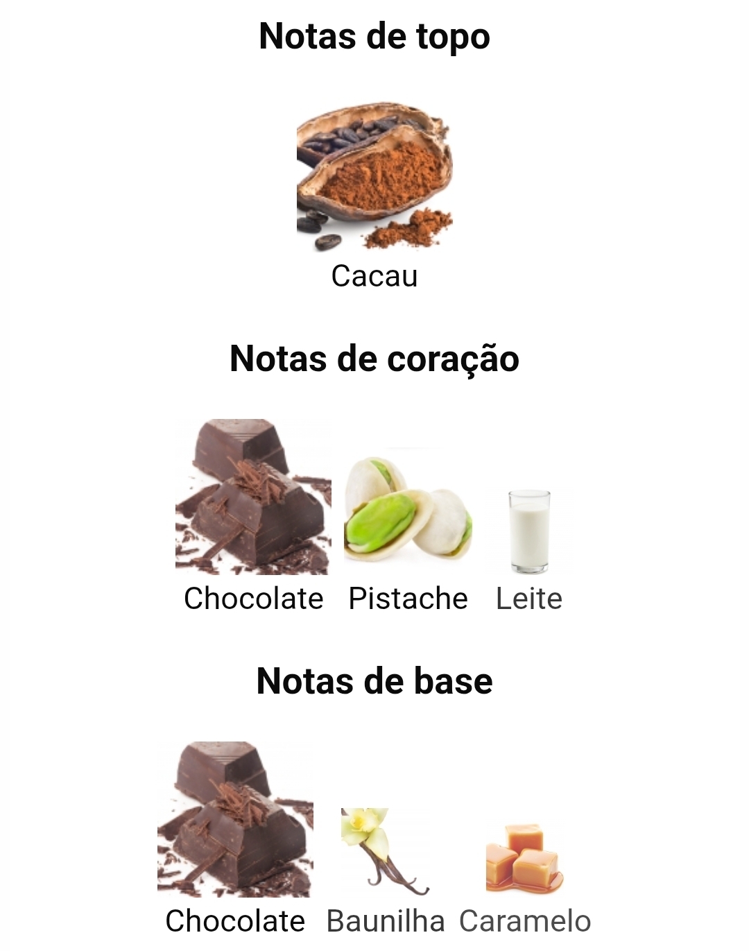 Notas de fragrância com imagens de cacau, chocolate, pistache, leite, baunilha e caramelo