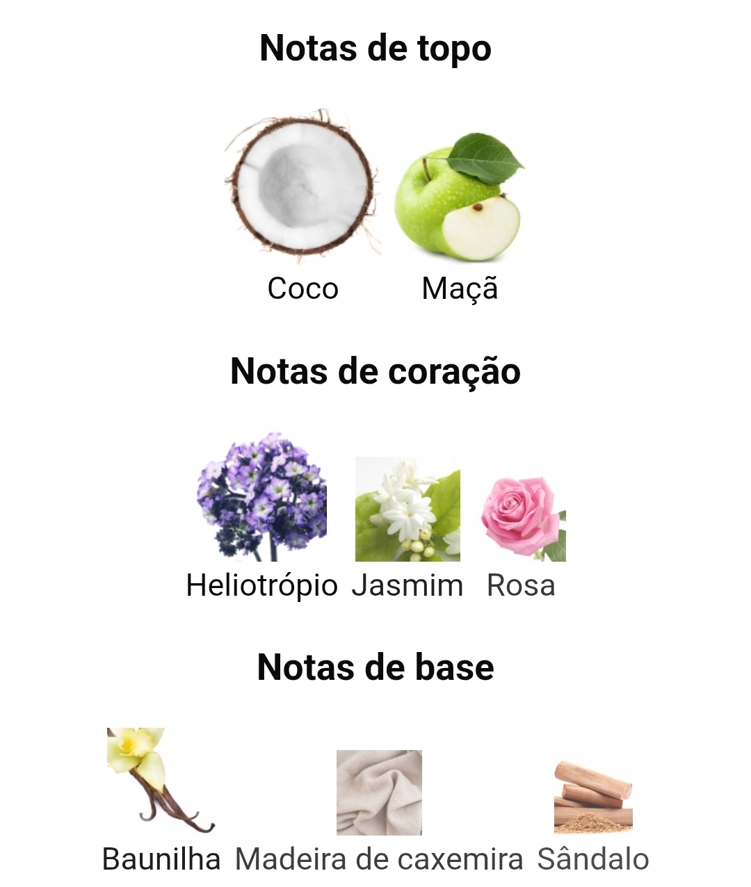 Notas olfativas do perfume divididas em notas de topo, coração e base com imagens representativas