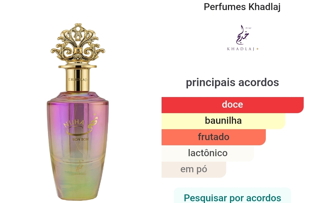 Nuha Bon Bon, da Khadlaj Perfumes, é uma fragrância floral frutada gourmand claramente direcionada ao público feminino.
