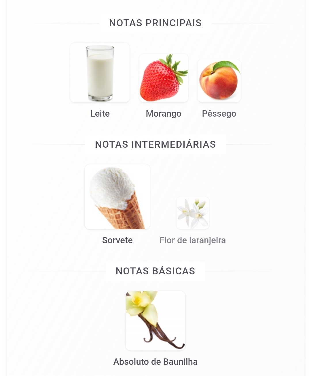 As notas de topo são leite, morango e pêssego; as notas de coração são sorvete e flor de laranjeira; e a nota de fundo é absoluto de baunilha.