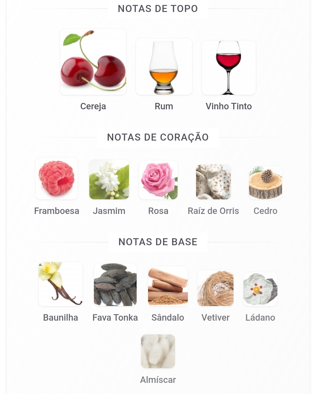 As notas de topo são: Cereja, Rum e Vinho Tinto. As notas de coração são: Framboesa, Jasmim, Rosa, Raíz de Orris e Cedro. As notas de fundo são: Baunilha, Fava Tonka, Sândalo, Vetiver, Ládano e Almíscar.