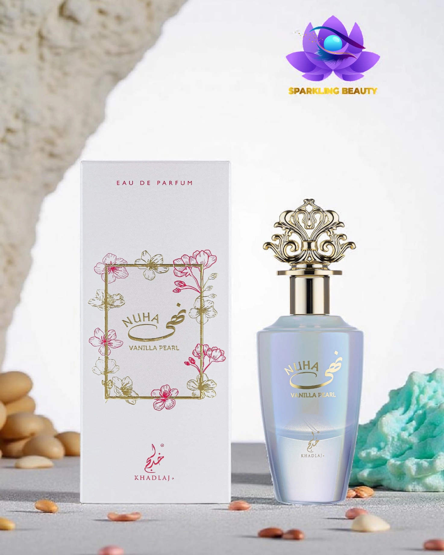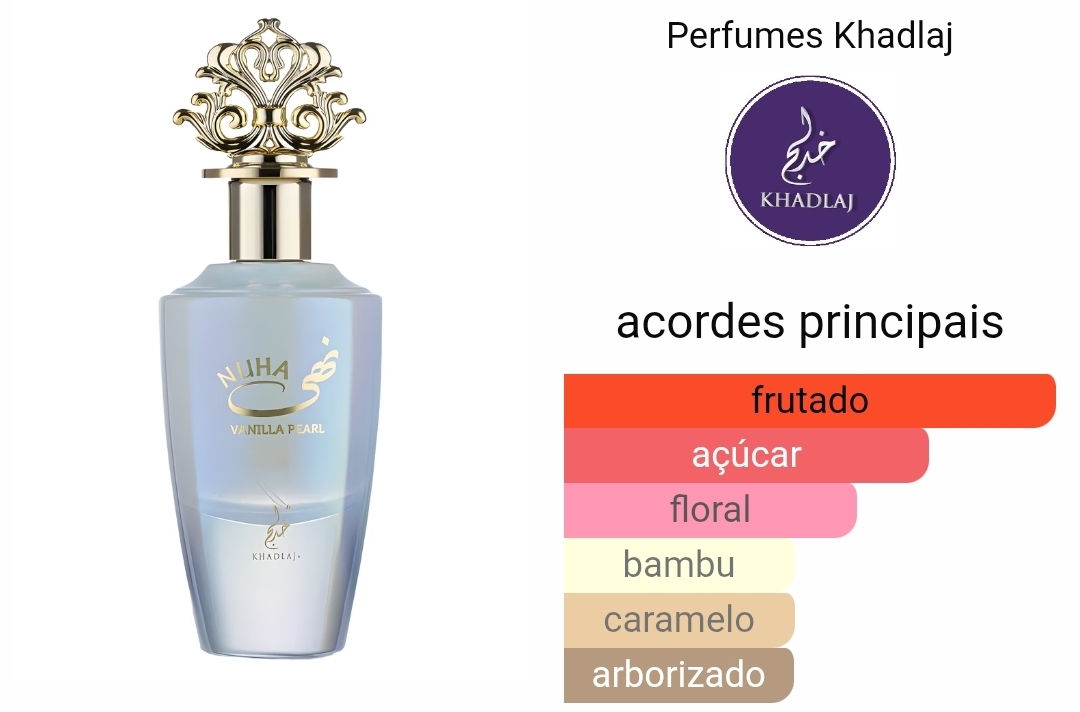 Nuha Vanilla Pearl, da Khadlaj Perfumes, é uma fragrância feminina floral frutada e gourmand.