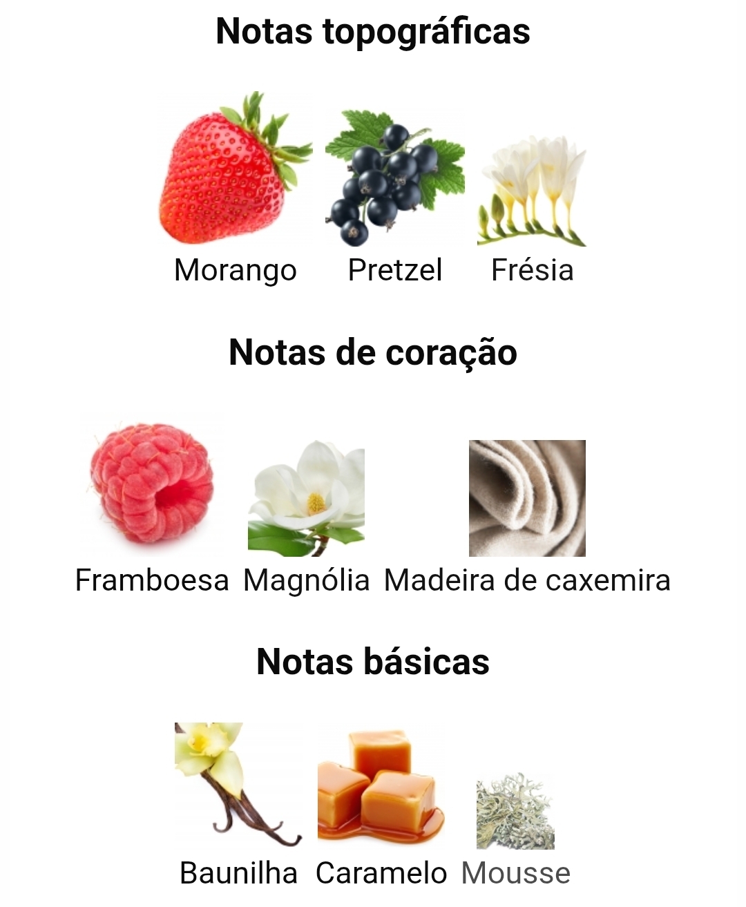 As notas de topo são morango, groselha preta e frésia; além de notas de framboesa, magnólia e madeira de caxemira; conforme observado no fundo são baunilha, caramelo e musgo.