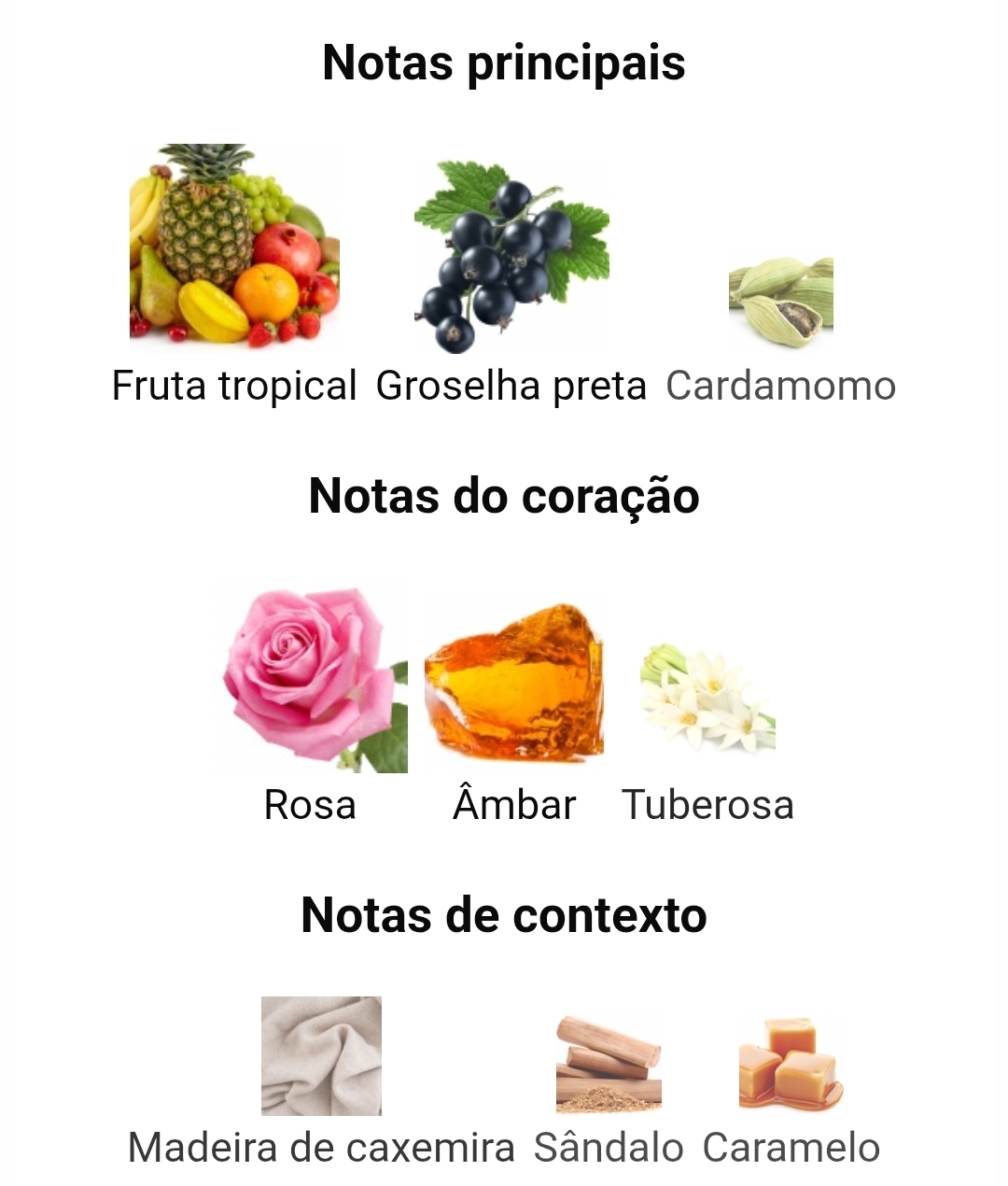 As notas de topo são frutas tropicais, groselha preta e cardamomo; as notas de coração são rosa, âmbar e tuberosa; as notas de fundo são madeira de cashmere, sândalo e caramelo.