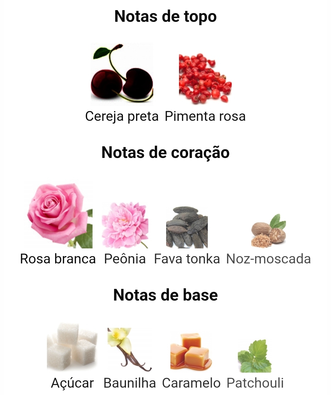 As notas de topo são cereja preta e pimenta rosa; as notas de coração são rosa branca, peônia, fava tonka e noz-moscada; as notas de fundo são açúcar, baunilha, caramelo e patchouli