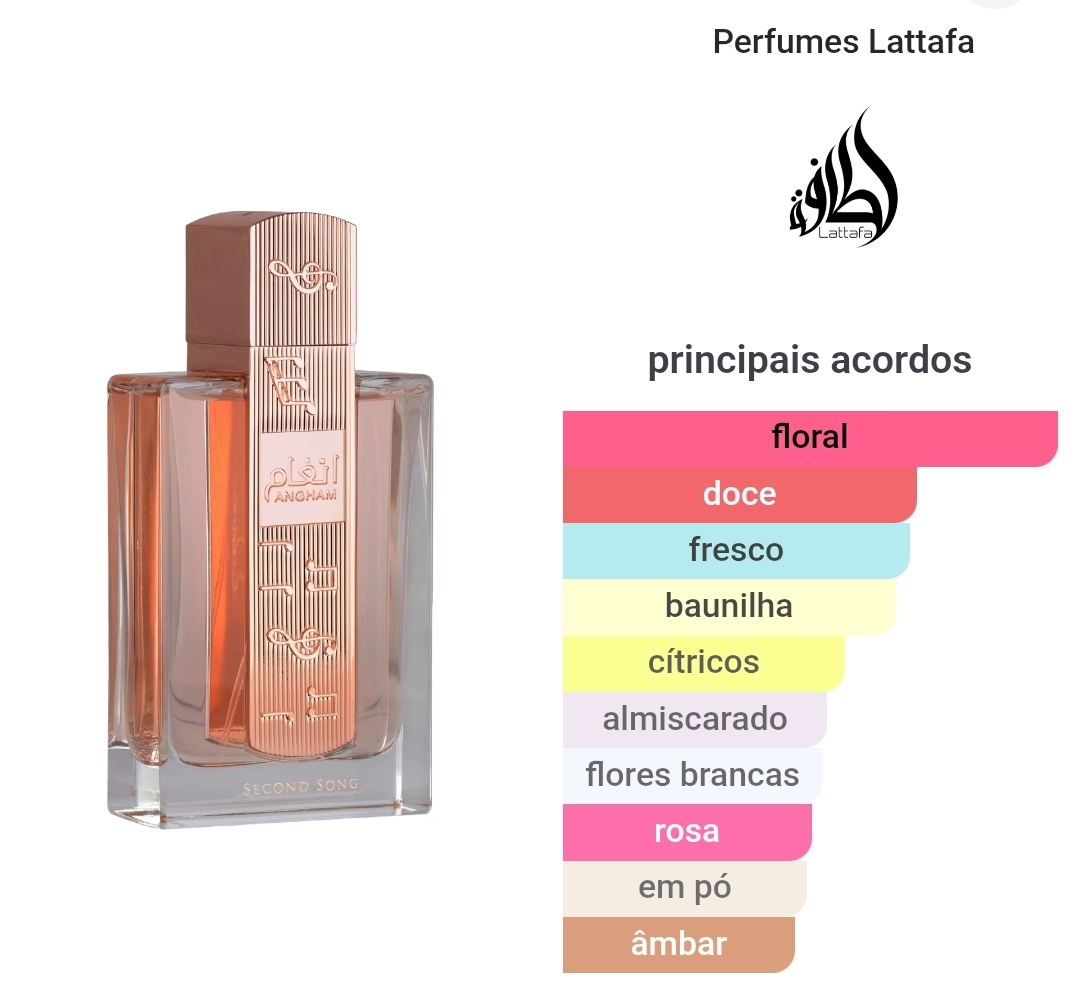 Angham Second Song, da Lattafa Perfumes, é uma fragrância Floral Frutada Gourmand feminina.